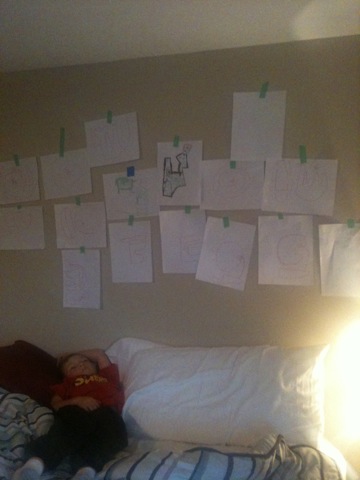 The little artist responsible for all of this is the one all tuckered out on my unmade bed. He thought my walls needed a change. So while I was in a meeting online… he drew his heart out and taped it all to my wall!