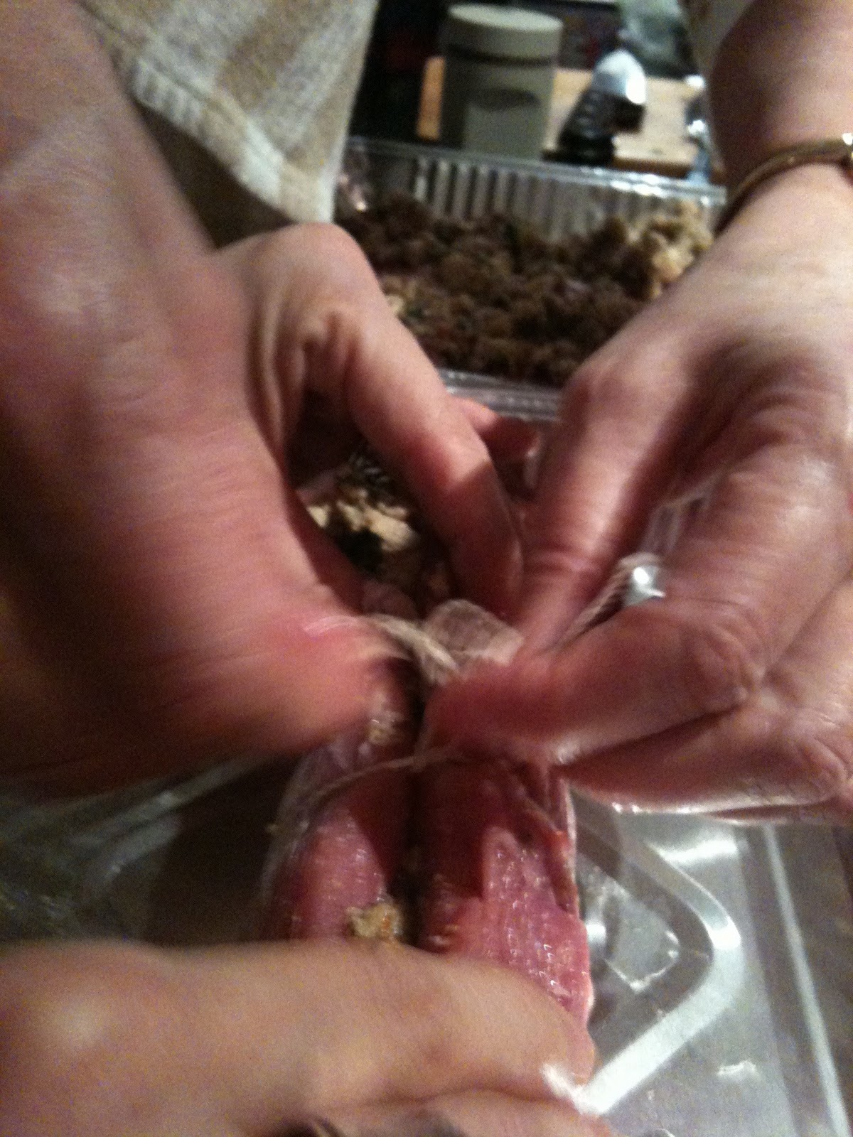 ROLL up each tenderloin tightly; tie with kitchen string in 2 or 3 places to secure (I had to find cotton string of some sort… so I used the kid’s extra yo-yo string… sshh don’t tell them!) Those are my momma’s hands helping me tie it up. 🙂 Place tenderloins, side-by-side, in shallow pan; brush with remaining dressing.